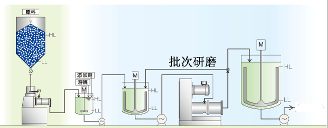 因材料研磨要求的不同,針對(duì)不同類(lèi)型的材料、溶劑、粒度要求,一般采用通過(guò)式研磨、循環(huán)式研磨、間歇式研磨、A/B式研磨、串聯(lián)式研磨等
